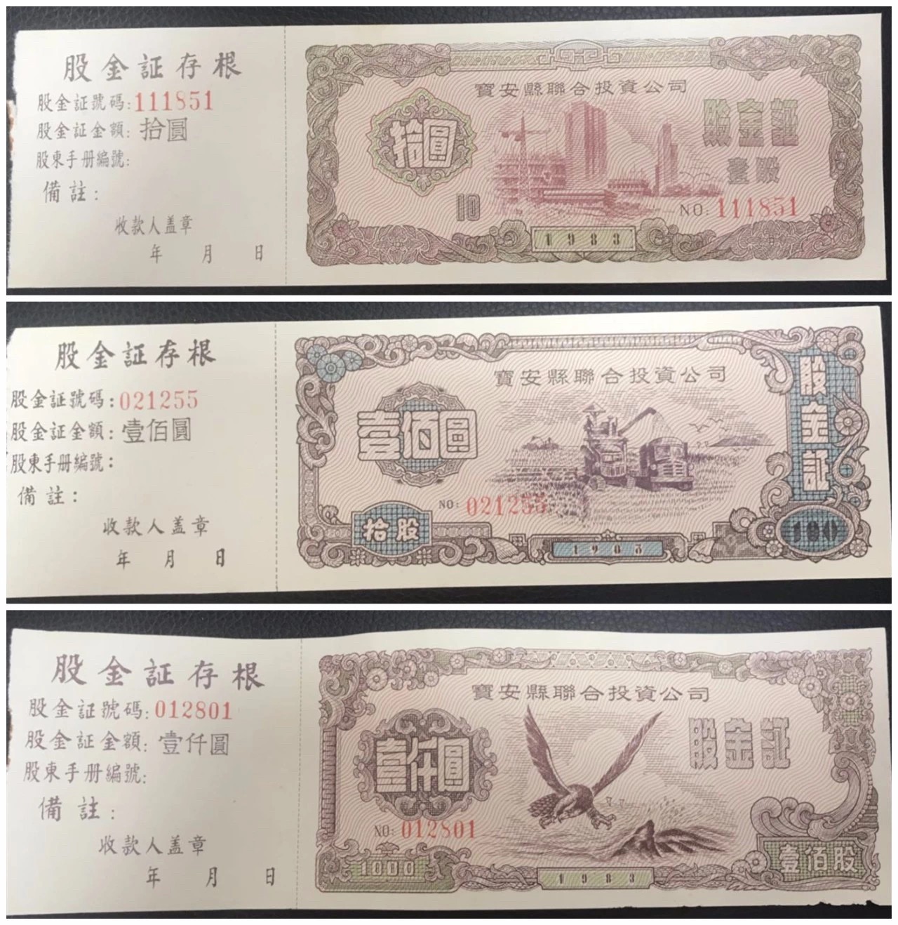 深圳博物馆入藏的新中国第一张股票套装是集团成立之初于1983年发行的股金证,分为1000元、100元和10元三张。捐赠仪式以及座谈会近日在深圳博物馆举行,博物馆副馆长蔡惠尧主持会议并代表博物馆正式收藏此套股金证。在座谈会上,蔡馆长表示,恰值改革开放四十周年时期,由www.leyu.com集团发行的新中国第一张股票具有重要的历史意义,通过这套股金证,公众能再次感受到特区第一批建设者们勇于开拓、勇于创新的奋斗精神。