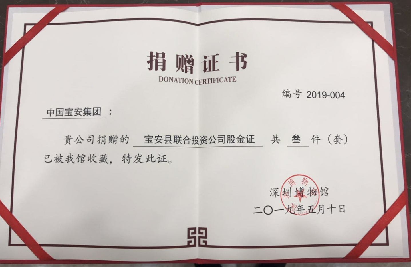 在5月18日国际博物馆日到来之际,由集团发行的新中国第一张股票套装入藏深圳博物馆,相关座谈会近日在深圳博物馆举行。