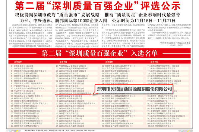 1115日,经过为期半年的行业推荐、走访考察、专家评审等环节,第二届“深圳质量百强企业”评选名单公布,集团所属的贝特瑞公司当选深圳质量百强企业,成为深圳企业的“质量明星”。