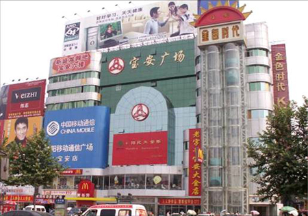 1996年开工建设的咸阳宝安购物广场主体6层,局部8层,占地2850平方米,建筑面积达14600平方米。